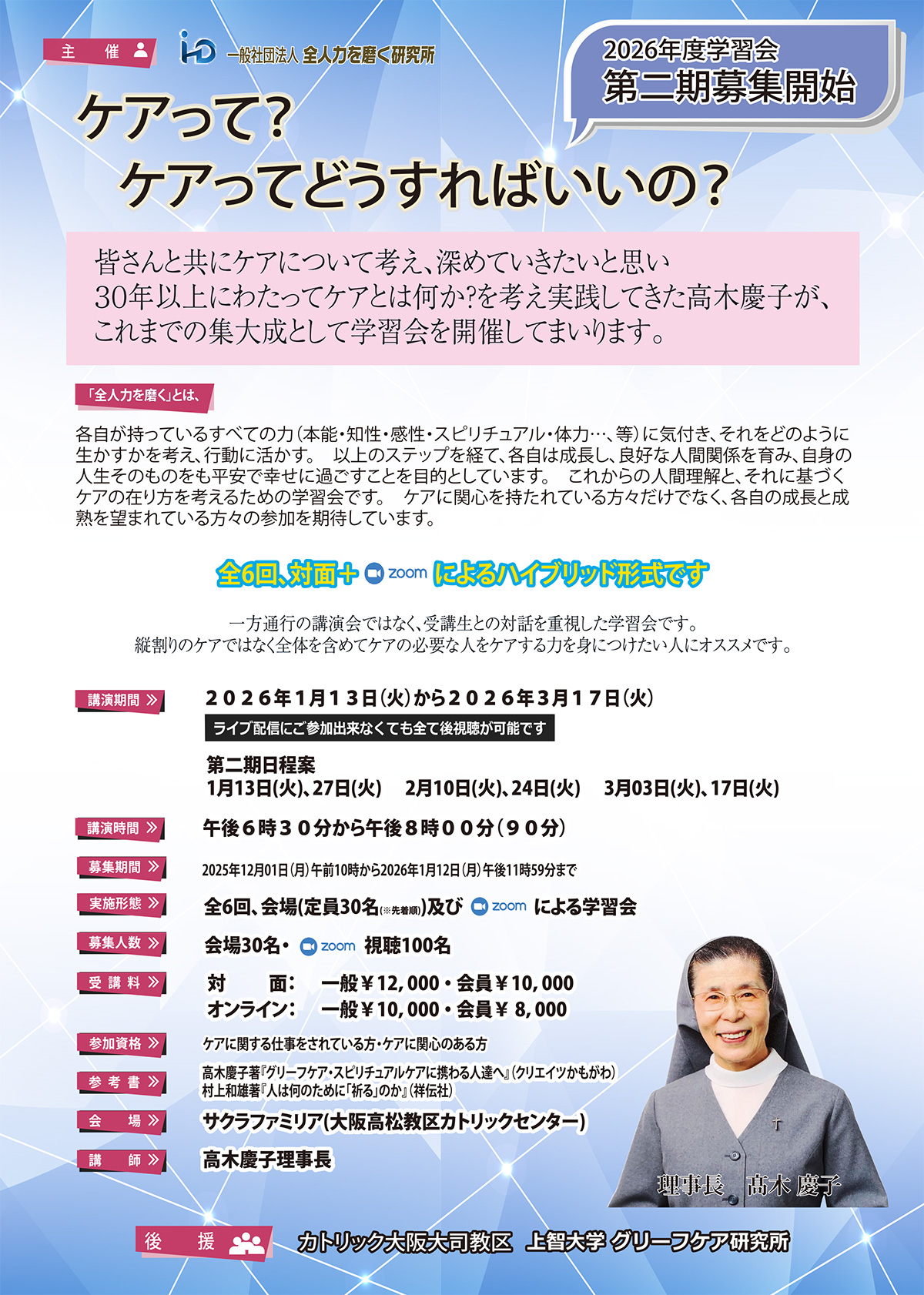 髙木慶子との対談会 全てのこころのケアに携わる人への「全人力を磨くとは?」(新春講座全4回)1月6日より