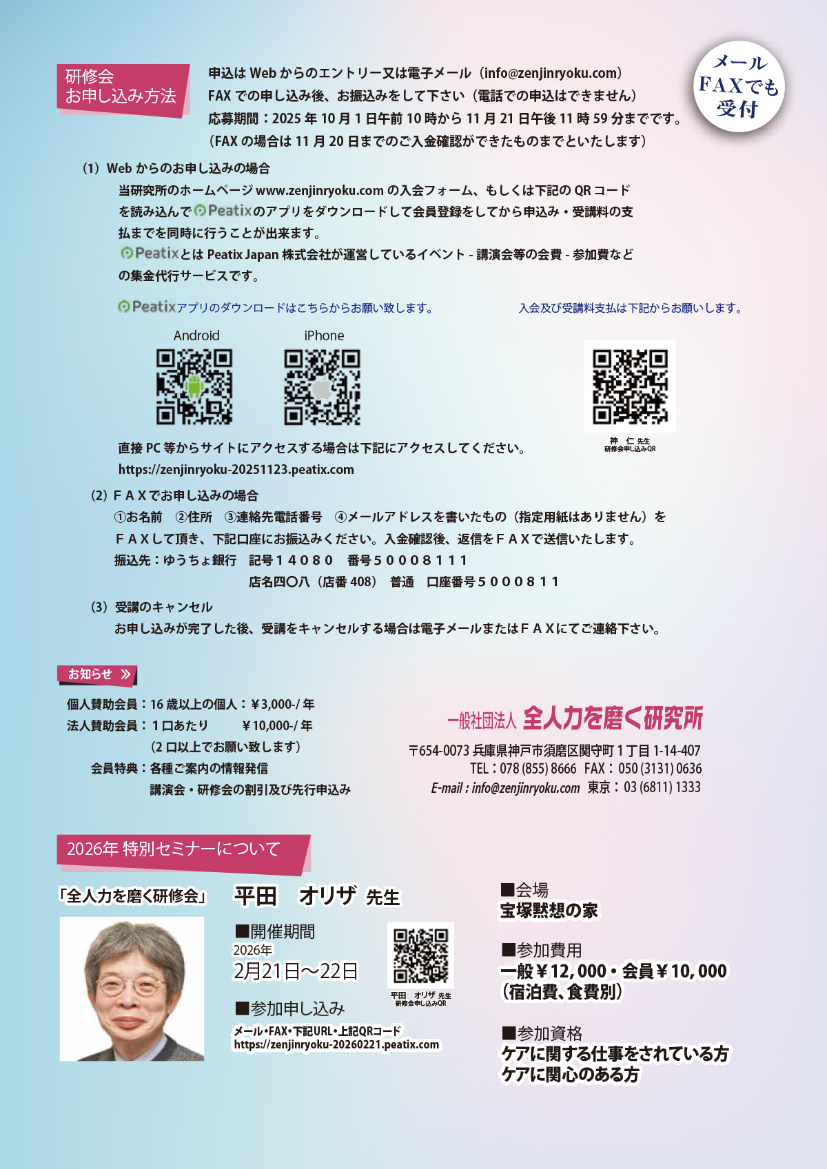 https://zenjinryoku-20251123.peatix.comPeatix.faxで対談会のお申し込みが出来ない場合はFAX(050-3131-0636)または