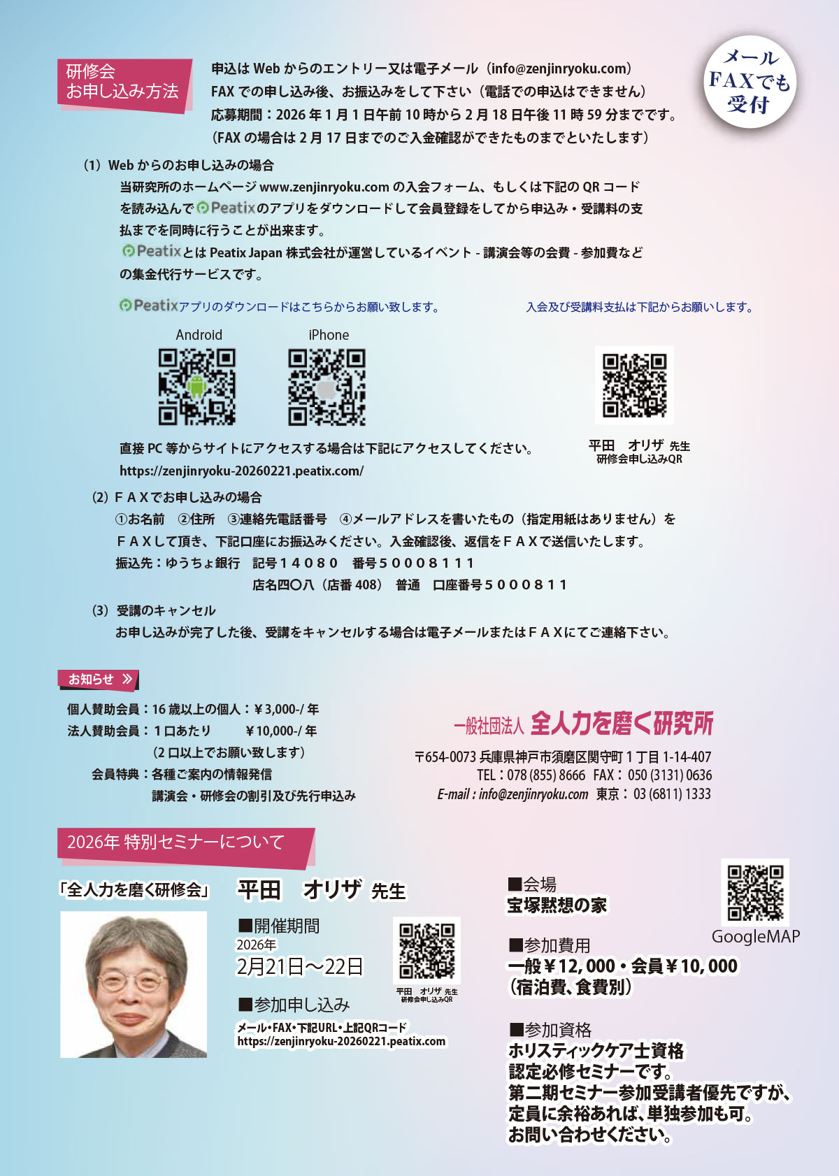 https://zenjinryoku-20260221.peatix.com/Peatix.faxで対談会のお申し込みが出来ない場合はFAX(050-3131-0636)または